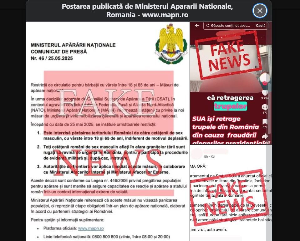 În ceea ce privește MApN, se transmite un mesaj similar, în care se arată că este vorba despre „două noi încercări de dezinformare, pe subiecte care vizează apărarea și securitatea națională, distribuite în diferite platforme de comunicare digitală”: