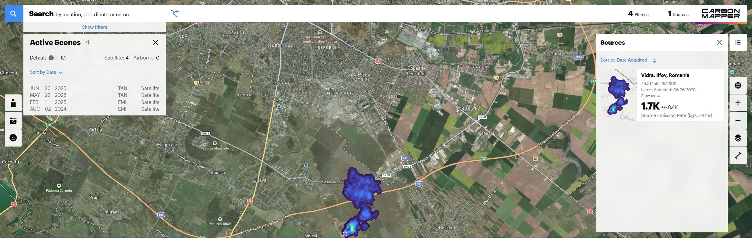 În februarie 2025, presa publică date fără precedent: sateliții EMIT (NASA), Tanager-1 și sistemul Carbon Mapper au identificat la Vidra–Sintești scurgeri de peste 2.500 kg/oră de metan – un record pentru România și printre cele mai mari din Europa.