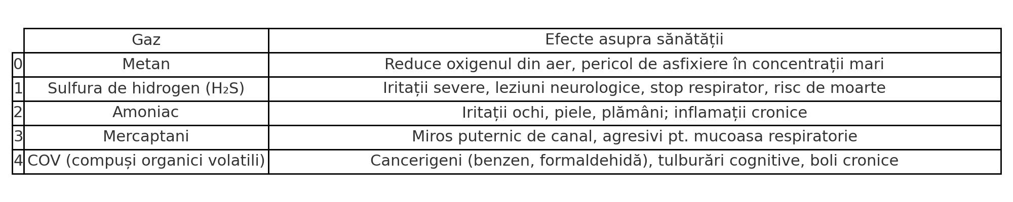 • Sulfura de hidrogen (H₂S): iritații, leziuni neurologice, poate fi letal.